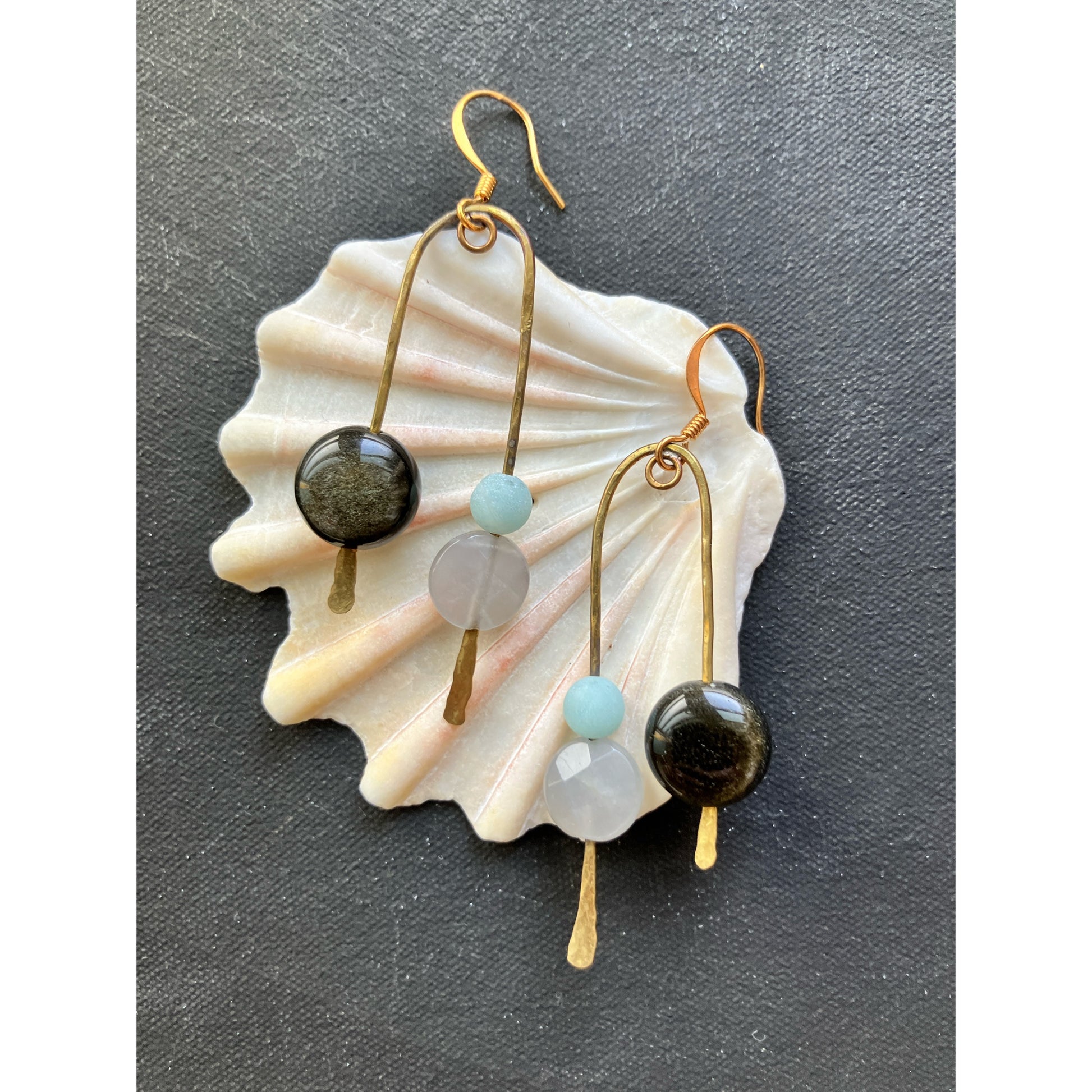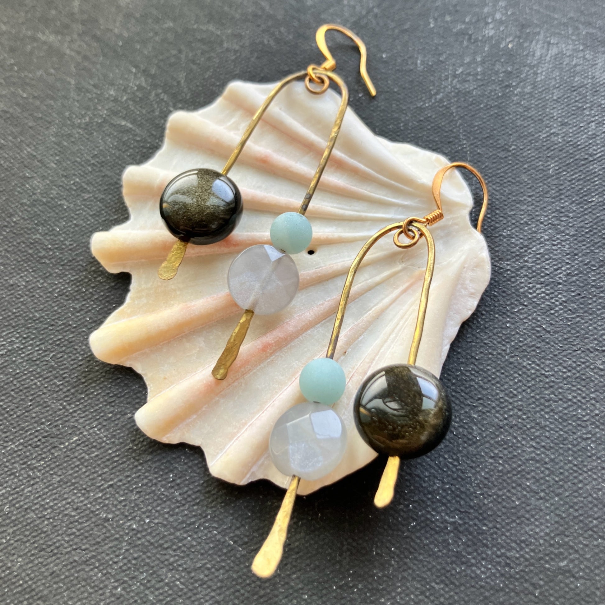こちらのイヤリングは、アーティストアレクサンダー・カルダーと彼の魔法のようなモビールアートにインスパイアされています。ゴールドシーンオブシディアン、アマゾナイト、そして真珠のビーズを使用しています。