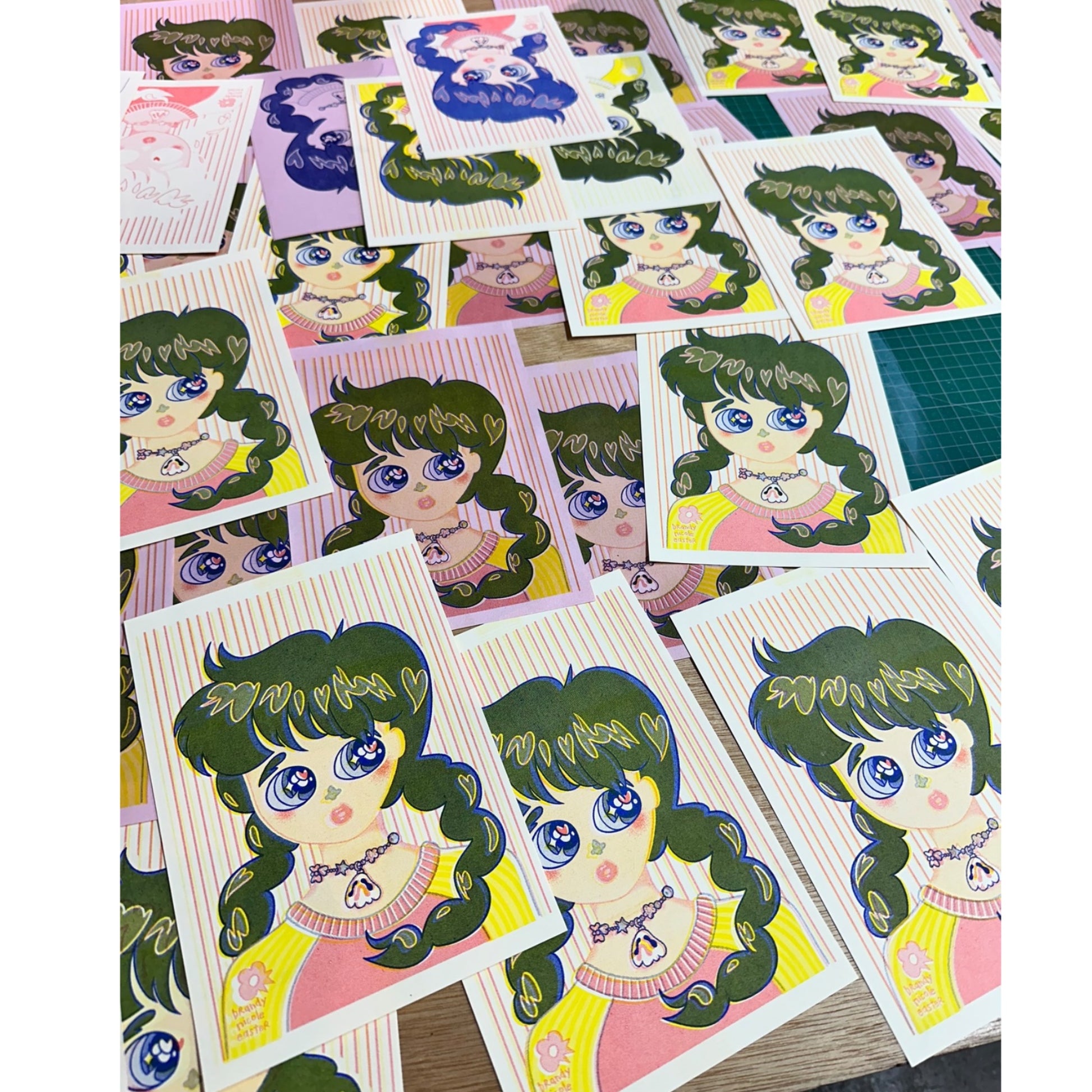 この不安そうな女の子は、幽霊のネックレスをつけています。 リソグラフプリントの工程上、プリントの位置が若干ずれているものがあります。 もし、より整列したプリント、もしくは、ずれても味が出ているものを希望でしたら、メッセージを送ってください。 そうでない場合はランダムに選ばせていただきます。