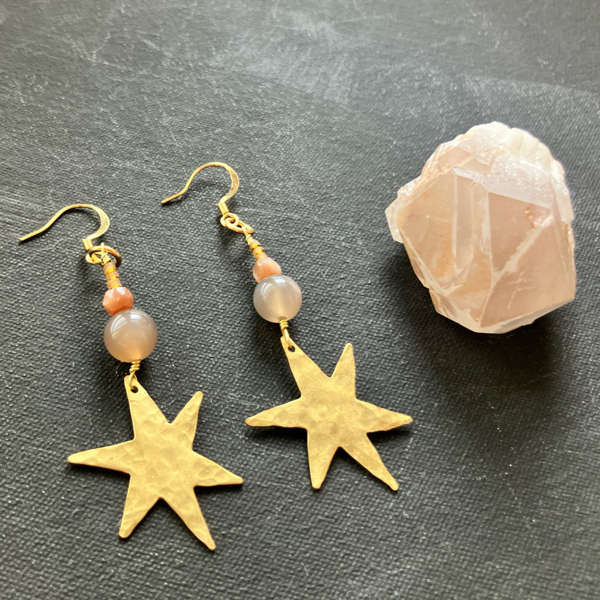 このイヤリングはタロットカードの「The Star」にインスパイアされています。星は希望と回復力の象徴です。 こちらはピーチムーンストーンと真鍮で作られています。ピーチムーンストーンの美しいピーチ色は、光に当たると煌めくような艶を持っています。