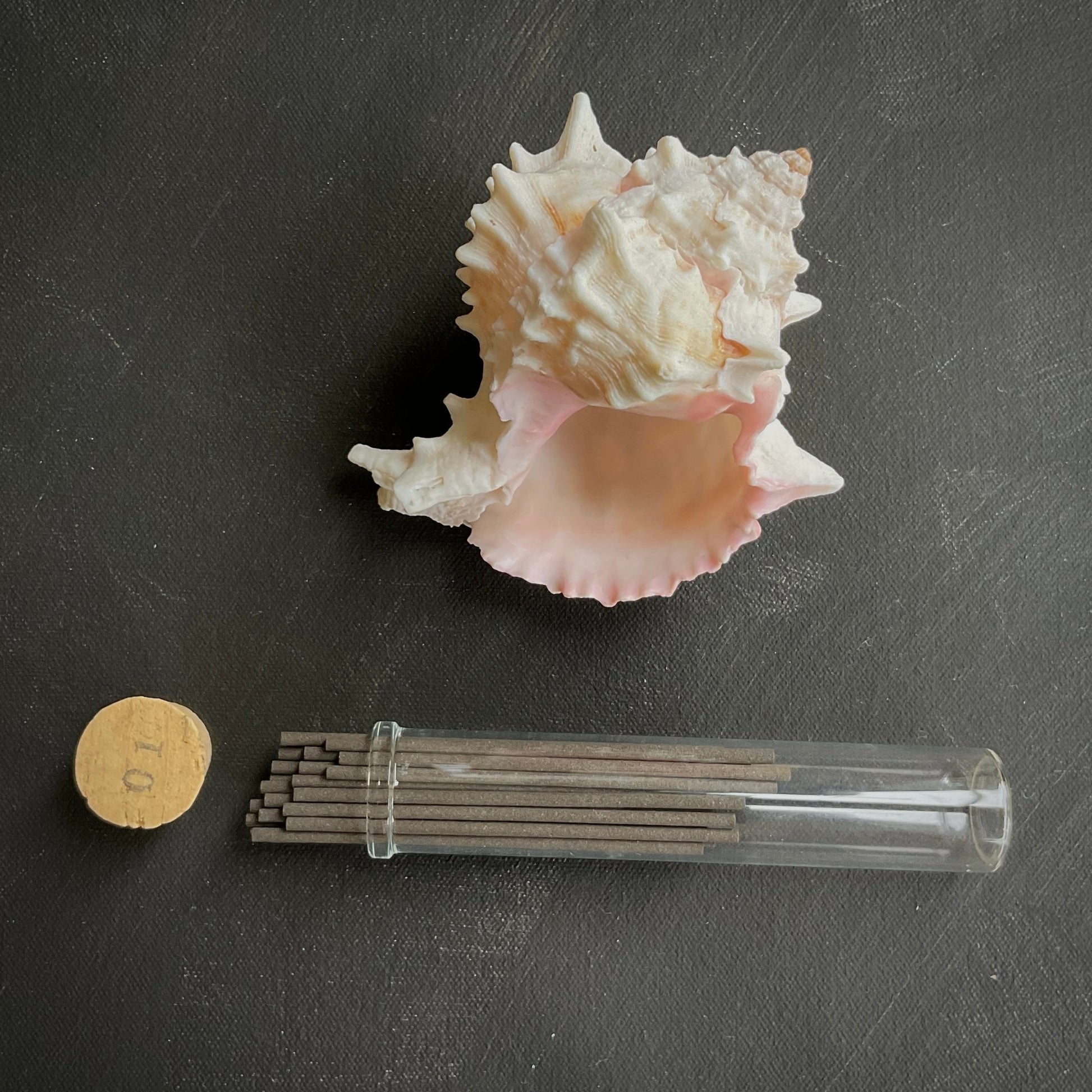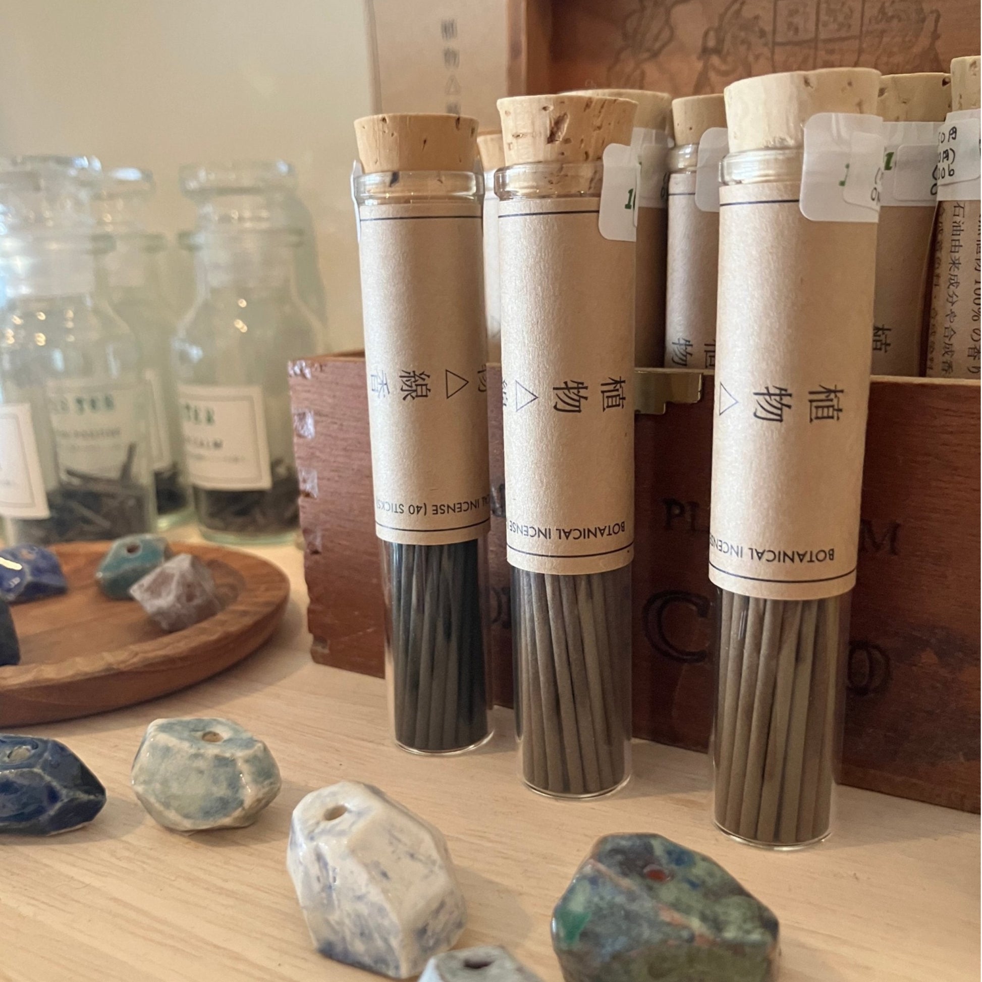 天然植物を100%使用し、石油成分や合成着色料、合成染料などを一切使用せず、素材そのもののみでできたオーガニック線香です。ガラス瓶の中に約40本入っています。 香りは、全部で7種類です。